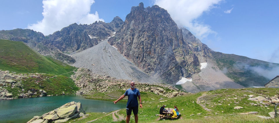 Je pars du Somport dans la brume, sur 2 km de route (berk!!) en direction de la station d'Astun. Heureusement dès que je m'élève au-dessus des pistes, les nuages s'estompent et j'arrive au Col des Moines sous un beau soleil. Je devine caché par quelques cumulus, Jean-Pierre. Jusque là je n'ai trouvé personne. Dès la jonction avec le GR du tour du Pic du Midi d'Ossau, quelques groupes jalonnent le sentier. Malgré le sac sur le dos, je n'ai aucun mal à doubler dans la remontée vers le col de Peyreget. Deux silhouettes bien connues (Aurélie et Adèle) sont en pause. Elles repartent avec moi. Au col nous en profitons pour s'échanger des prises de photos puis je les laisserai au bord du lac de Peyreget où une pause baignade les appelle. Je ne les reverrais plus mais nous resterons en contact par téléphone. De mon côté je descends jusqu'au refuge de Pombie où malheureusement la brume va et vient. Alain ne va pas tarder à arriver, ça fait plaisir. Demain matin Manu monte également, double plaisir !!. Au programme du lendemain, journée Off de la HRP est prévue l'ascension de JP !!